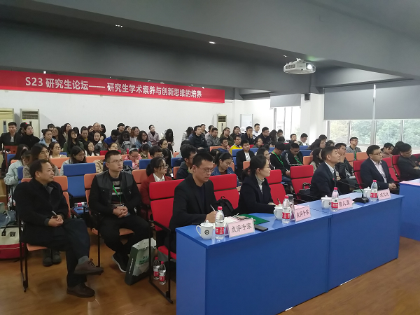 我校研究生院常务副院长项文化教授对参与本次论坛的领导、老师、同学表示了热烈欢迎,他希望参会的研究生能够借助论坛这个交流契机,开阔科研创新视野。随后,曾庆银做了题为《研究生学术素养与创新能力培养》特邀报告。他结合自己国外攻读博士学位的经历,和与会师生分享了知识的获取、分析、表达以及如何卓有成效的做出创新工作。他谈到,学位与研究生教育,既要创新教育方式方法,也要鼓励创新精神培养和促进创新能力提升。特邀嘉宾刘云国以《磁性耦合氧化石墨烯衍生材料对多元组分中重金属离子的吸附机理研究报告》为案例,从提出问题、到分析解决问题再到结论检验和论述应用意义,系统的阐释了科学研究的方法论,为与会师生科研思路、实验设计、创新研究提供了一个可借鉴的“模板”。