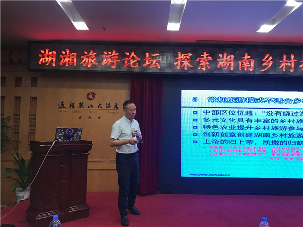 乡村旅游如何助力乡村振兴?湖南乡村旅游面临什么机遇与挑战?6月24日上午,由湖南省旅游发展委员会指导,湖南日报社、湖南师范大学、湖南省旅游教育专业委员会主办的湖湘旅游论坛在长沙召开,十多名省内外旅游专家,以“探索湖南乡村振兴与乡村旅游发展之路”为主题,发表精彩见解,碰撞思想火花。旅游学院院长钟永德教授、副院长戴美琪教授、刘嘉佳老师及2016、2017级研究生参加了此次论坛。
