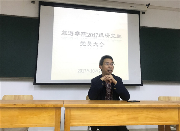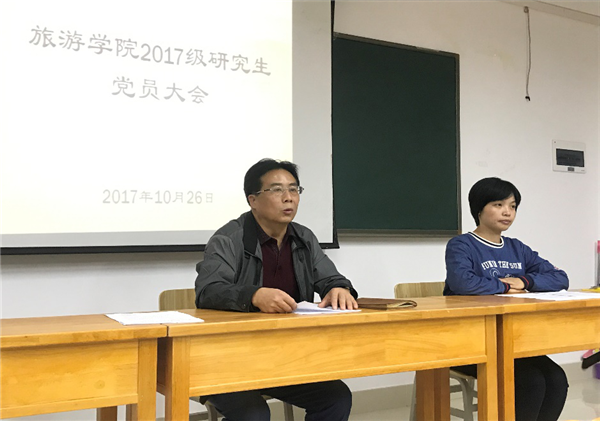 2017年10月26日下午,在中国共产党第十九次全国代表大会顺利闭幕之际,旅游学院2017级研究生党员大会在文综楼南1004隆重召开。出席本次会议的有旅游学院党委书记胡建刚同志,旅游学院2017级研究生党支部支部书记候选人、旅游学院硕士生导师罗明春同志,旅游学院党建工作秘书范艳霞同志,以及2017级全体研究生党员,会议由研究生秘书胥俊同志主持。