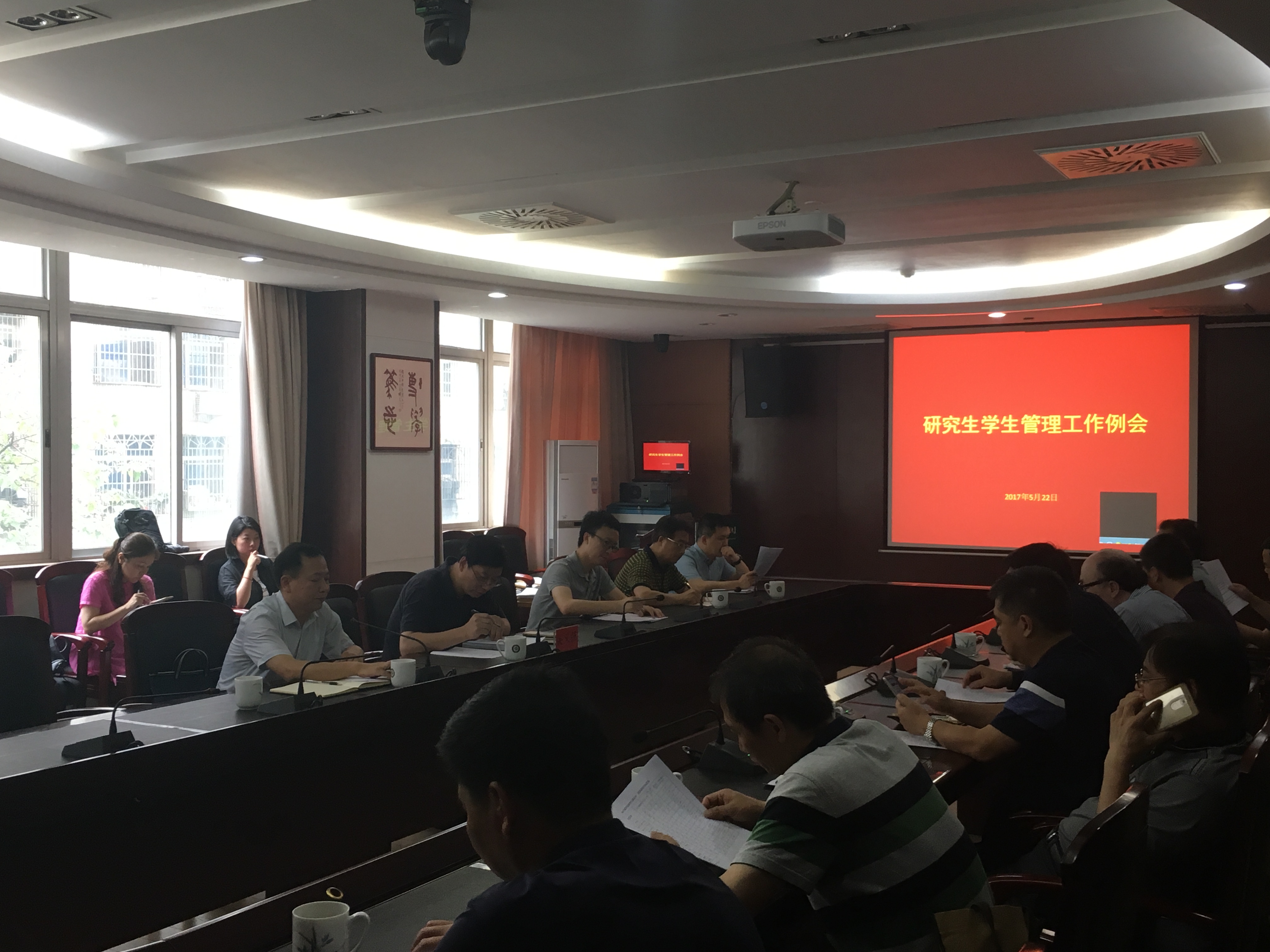 2017年5月22日下午,学校研究生学生管理工作例会在行政楼4楼3会议室召开,副校长兼研究生院院长吴义强出席会议并讲话,各研究生培养学院党委书记、辅导员或教学秘书、研究生思想政治教育与管理科科长黄杨参加会议。会议由研究生工作部部长张仕吉主持。