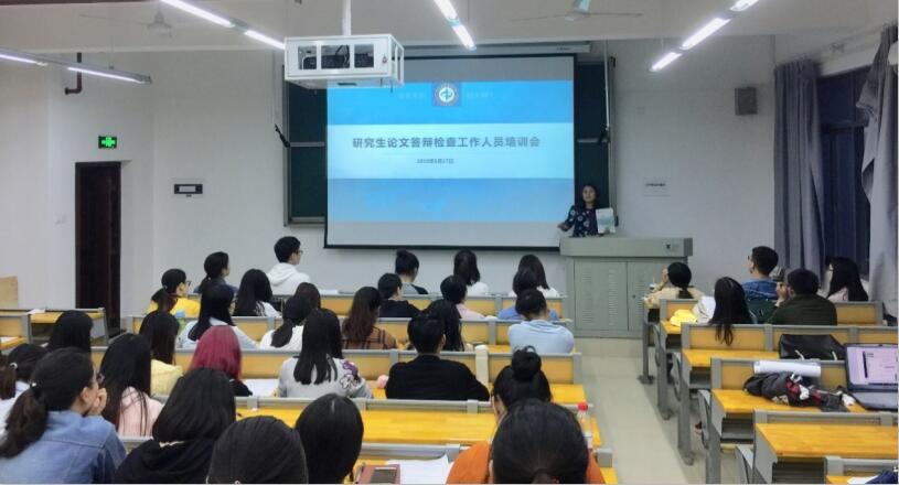 为进一步规范我校研究生毕业(学位)论文答辩,提高检查人员工作素质,2019年春季研究生毕业(学位)论文答辩检查工作人员培训会于201951719:00-21:30在博文楼南805举行,60多名研究生检查员接受了培训。本次培训会由学校研究生学生会的学术部组织,研究生院副院长蒋洁霞指导并主持。