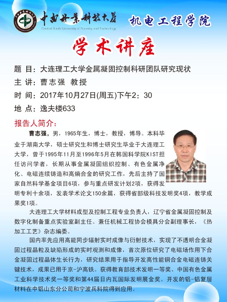 曹志强,教授,博导。本科毕业于湖南大学,硕士研究生和博士研究生毕业于大连理工大学,曾于1995年11月至1996年5月在韩国科学院KIST担任访问学者,长期从事金属凝固组织控制、有色金属净化、电磁连续铸造和高熵合金的研究工作,先后主持了国家自然科学基金项目6项,参与重点研发计划2项,获得发明专利十余项,发表学术论文150余篇,获得省部级科技发明奖4项,教学成果奖1项。